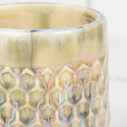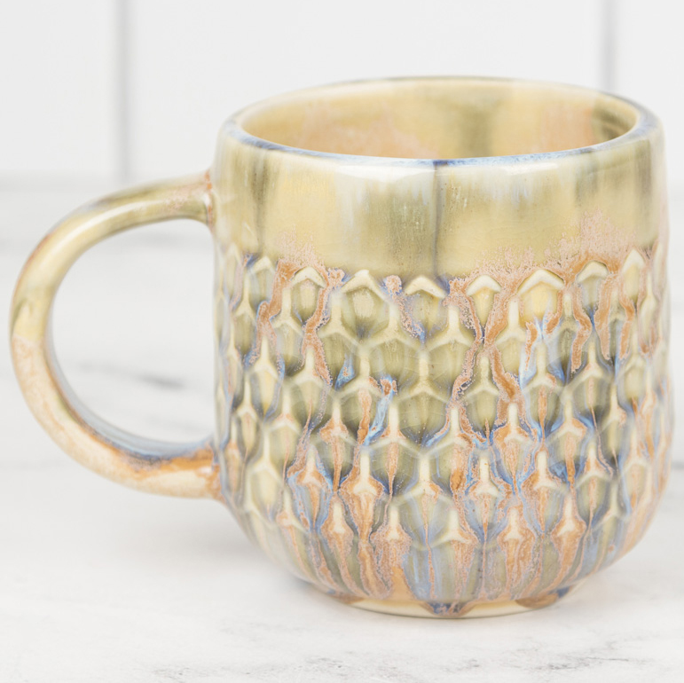 - Randomly brush 1 coat of SW-401 Light Flux and SW-402 Dark Flux over the rim and the top ¼ of mug’s honeycomb texture and handle.
